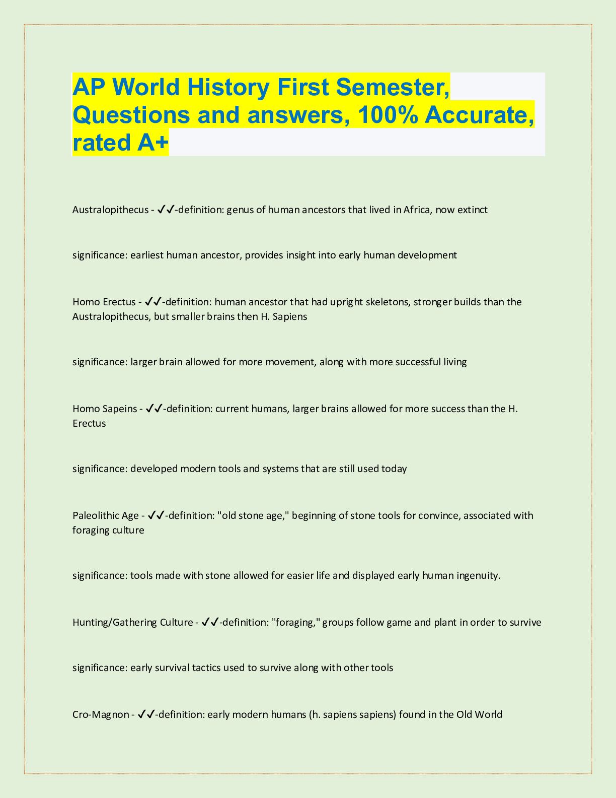 AP World History First Semester, Questions and answers, 100% Accurate, rated A+ Australopithecus - ✔✔-definition: genus of human ancestors that lived in Africa, now extinct significance: earlies...