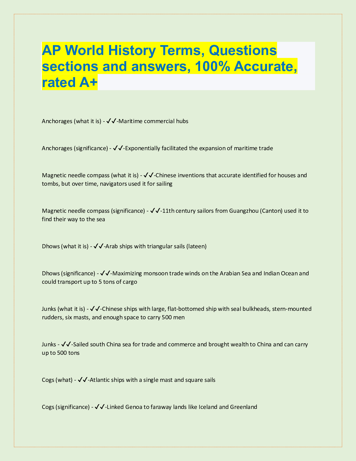 AP World History Terms, Questions sections and answers, 100% Accurate, rated A+ Anchorages (what it is) - ✔✔-Maritime commercial hubs Anchorages (significance) - ✔✔-Exponentially facilitated the...