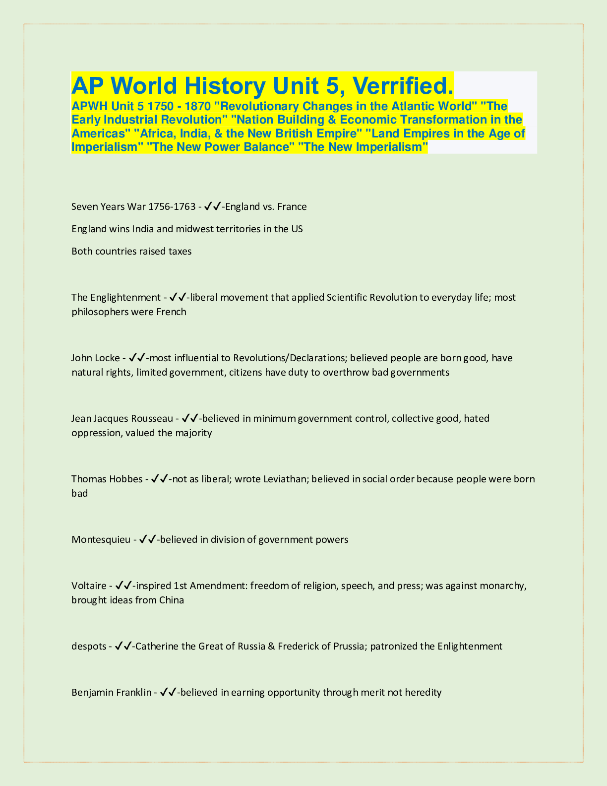 History> QUESTIONS & ANSWERS > AP World History Unit 5, Verrified. APWH Unit 5 1750 - 1870 "Revolutionary Changes in the Atlantic World" "The Early Industrial Revolution" "Nation Building & Economic Transformation in the Americas" "Africa, India, & the New British Empire" "Land Empires in the Age of (All)