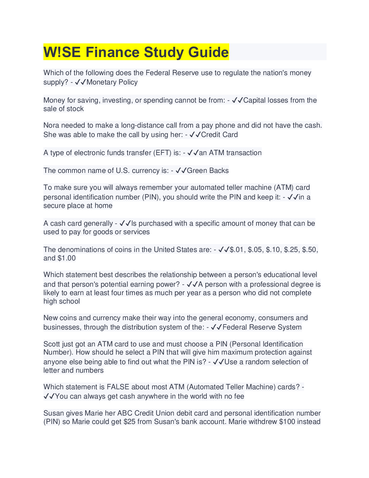 Finance > STUDY GUIDE > W!SE Finance Study Guide | 100 Questions with 100% Correct Answers (All)