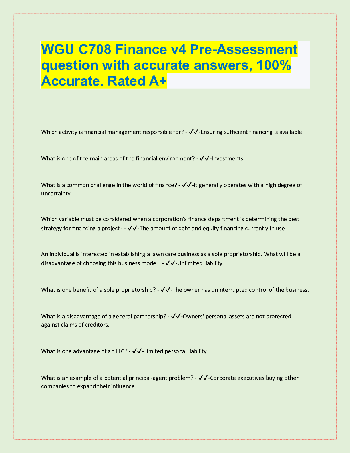 Finance > QUESTIONS & ANSWERS > WGU C708 Finance v4 Pre-Assessment Questions and Answers 100% Solved (All)