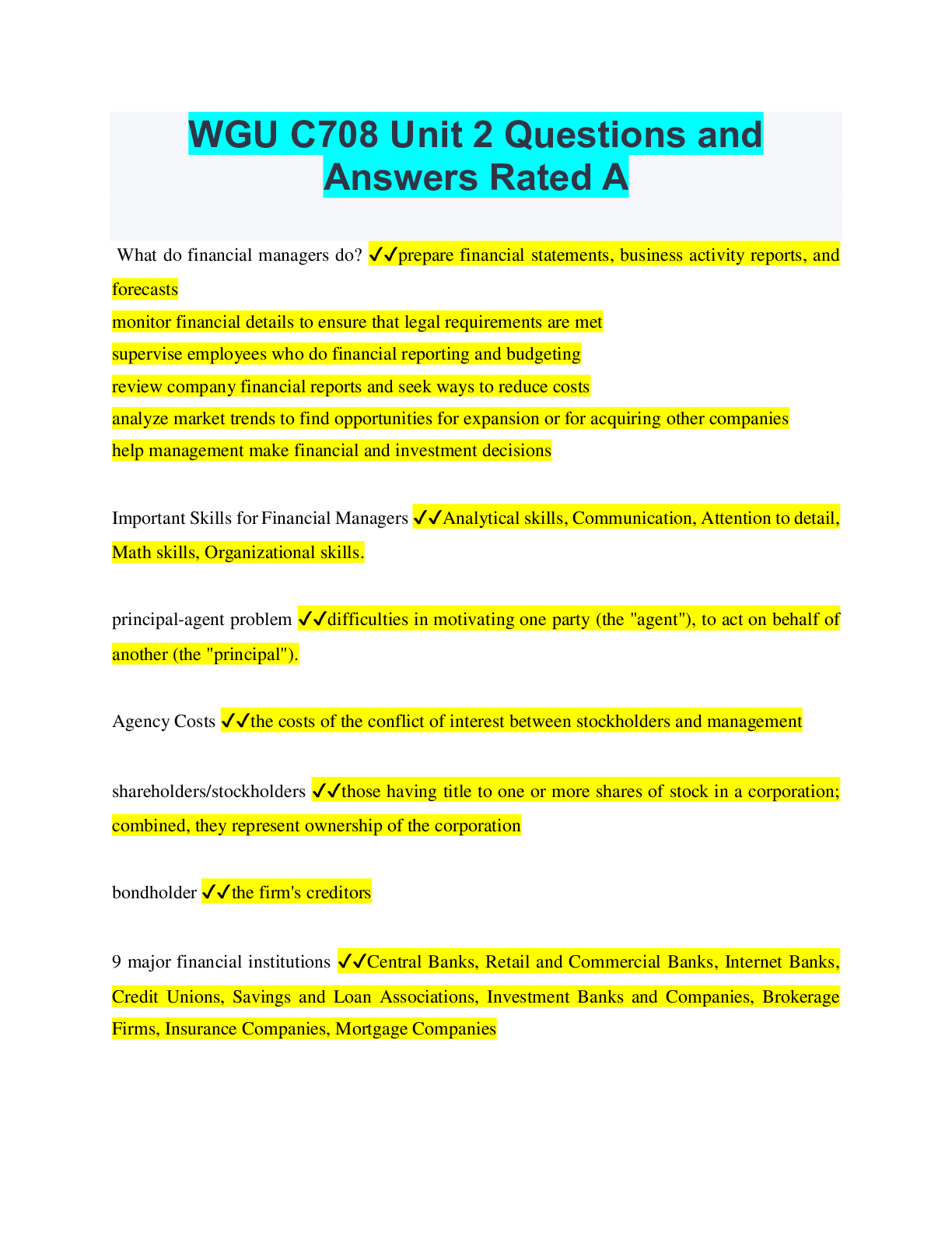 Finance > QUESTIONS & ANSWERS > WGU: C708: Principles of Finance Questions and Answers Already Passed (All)