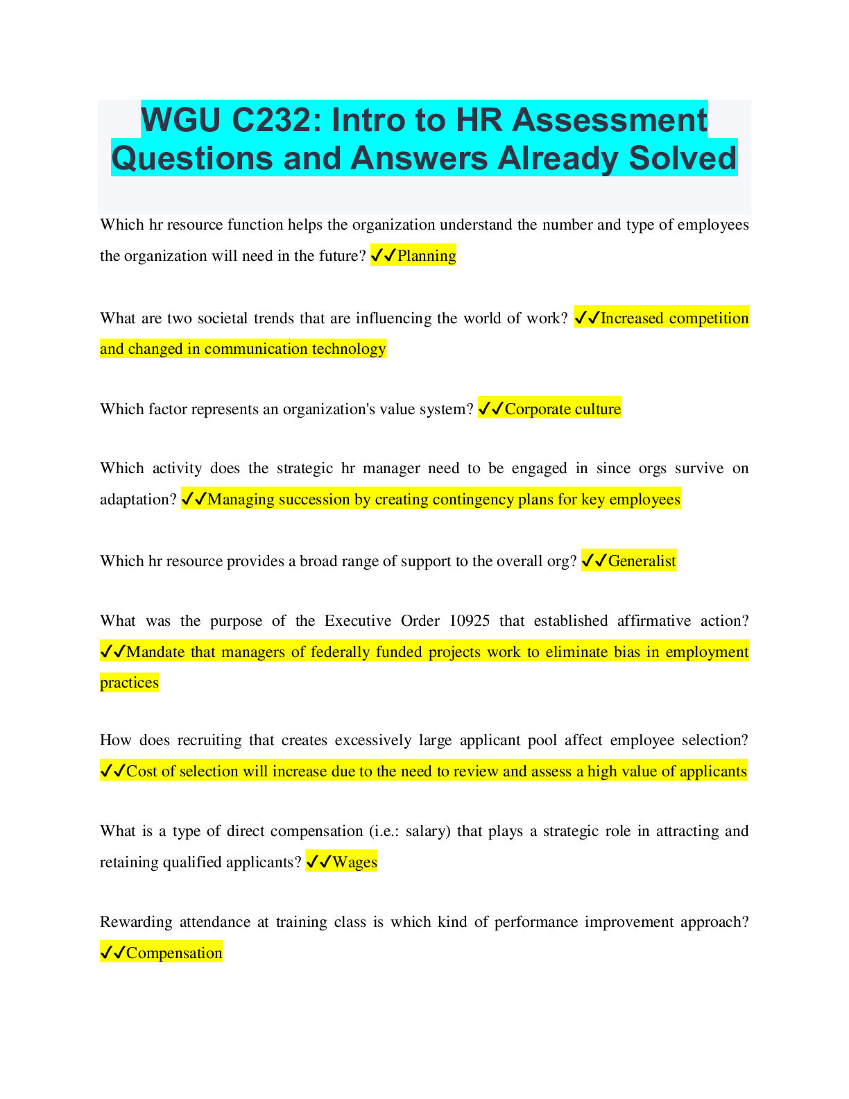 Human Resource Management > QUESTIONS & ANSWERS > WGU C232: Intro to HR Assessment Questions and Answers Already Solved (All)