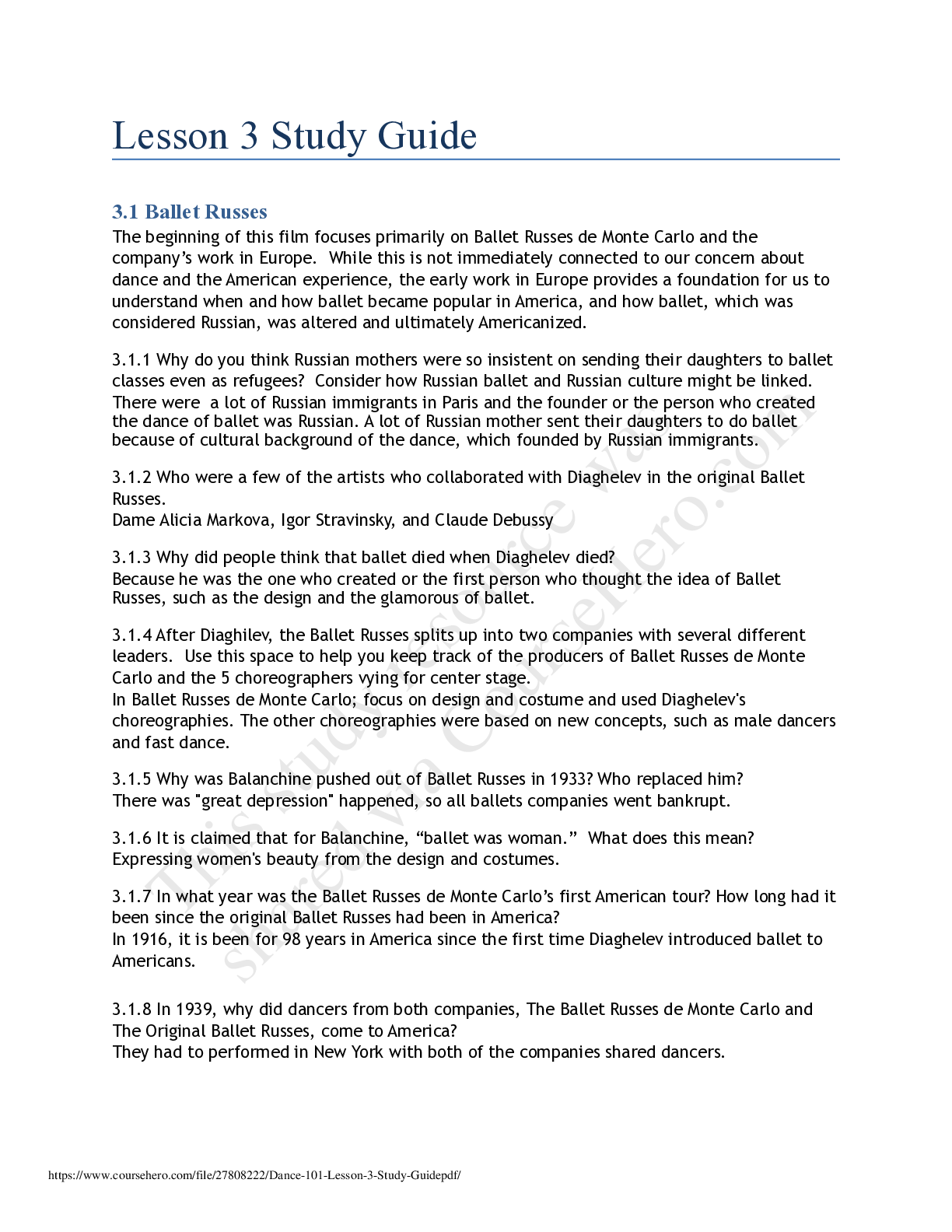Dance 100 > Research Paper > University of Washington - DANCE 101Dance 101 Lesson 3 Study Guide. (All)
