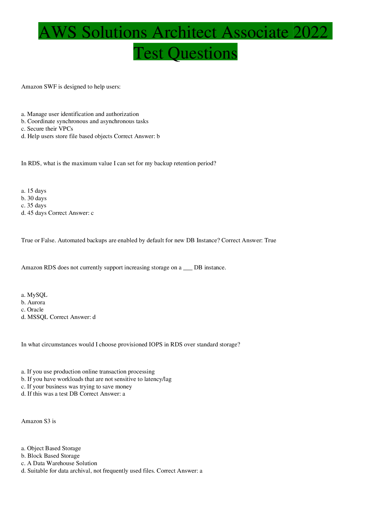 Architecture > EXAMs > AWS Solutions Architect Associate 2022 Test Questions AND ANSWERS ALL CORRECT (All)