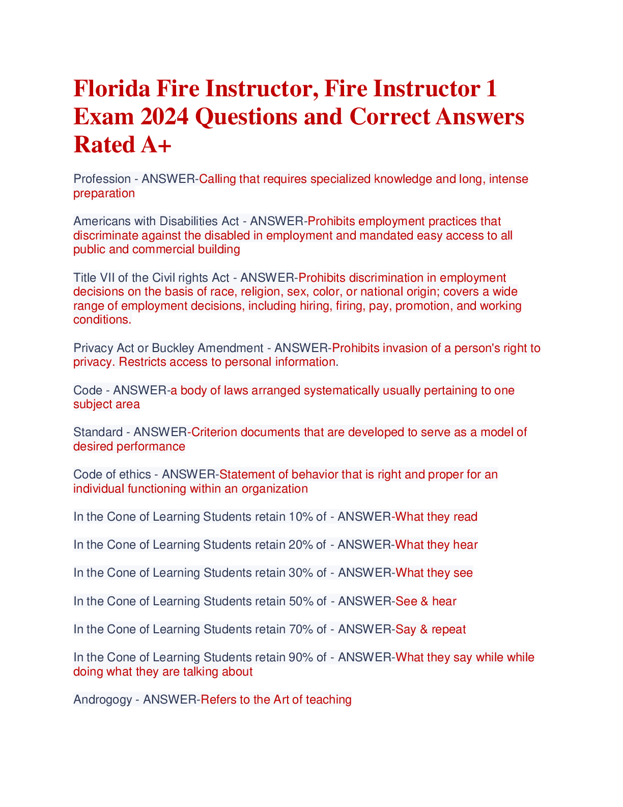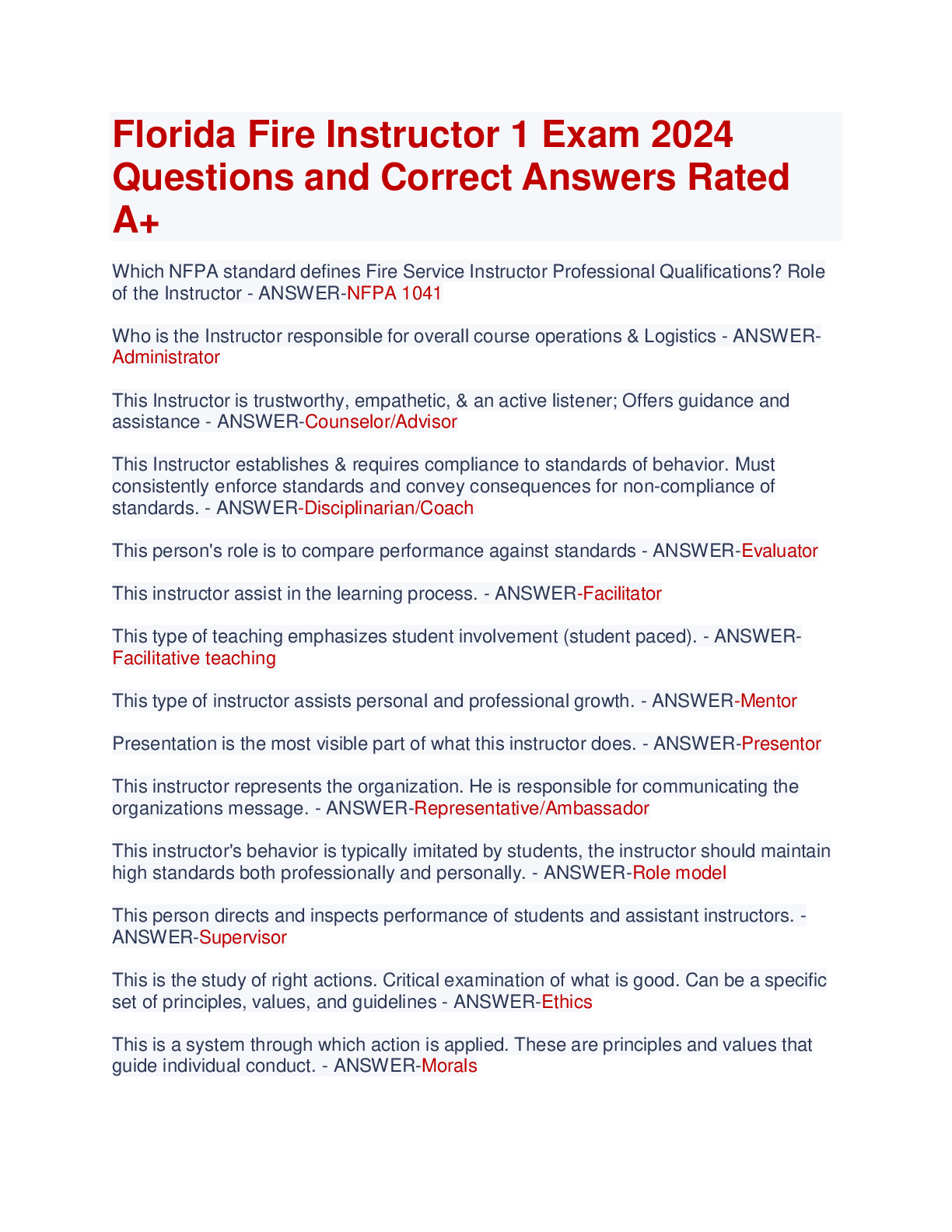 Art > EXAM > Florida Fire Instructor, Fire Instructor 1 Exam 2024 Questions and Correct Answers Rated A+ (All)