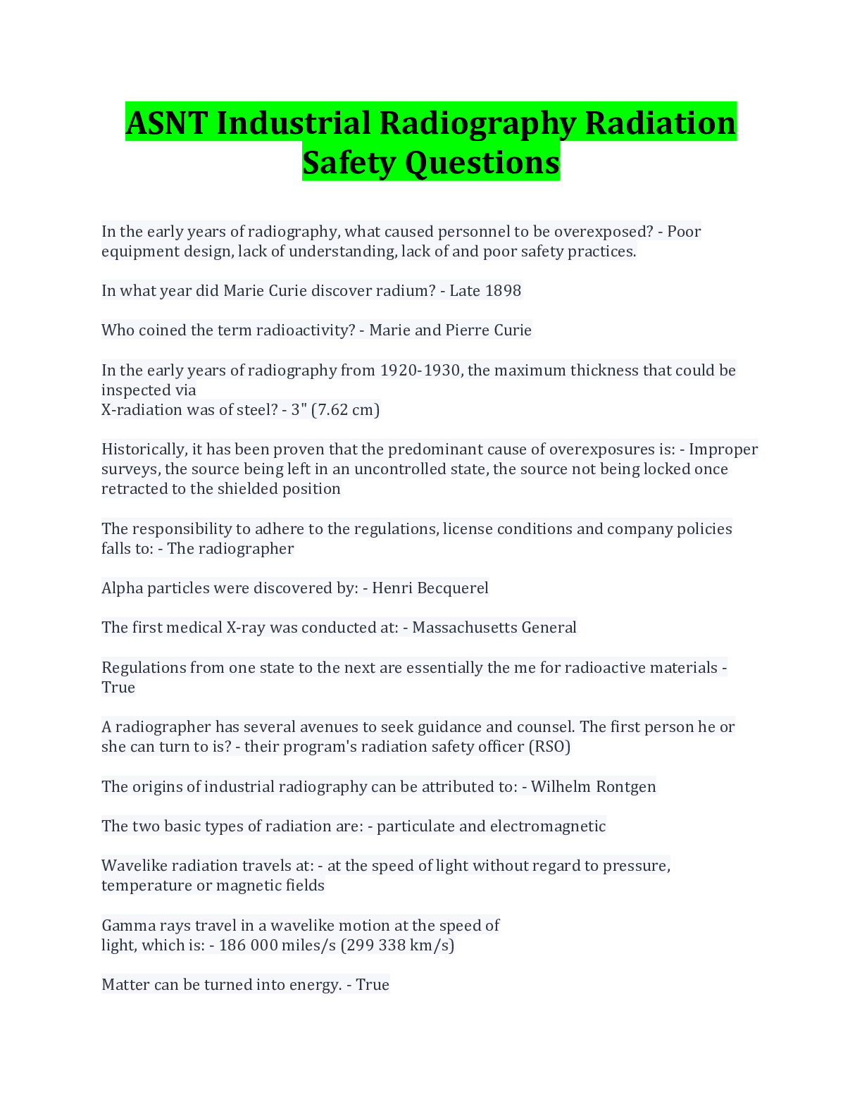 Physics > EXAMs > ASNT Industrial Radiography Radiation Safety Questions And Answers (All)