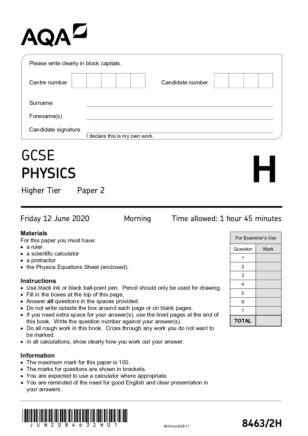 Physics > EXAMs > AQA GCSE PHYSICS 8463/1H Paper 1 Higher Tier Mark scheme June 2022 Version: 1.0 Final Mark Scheme (All)