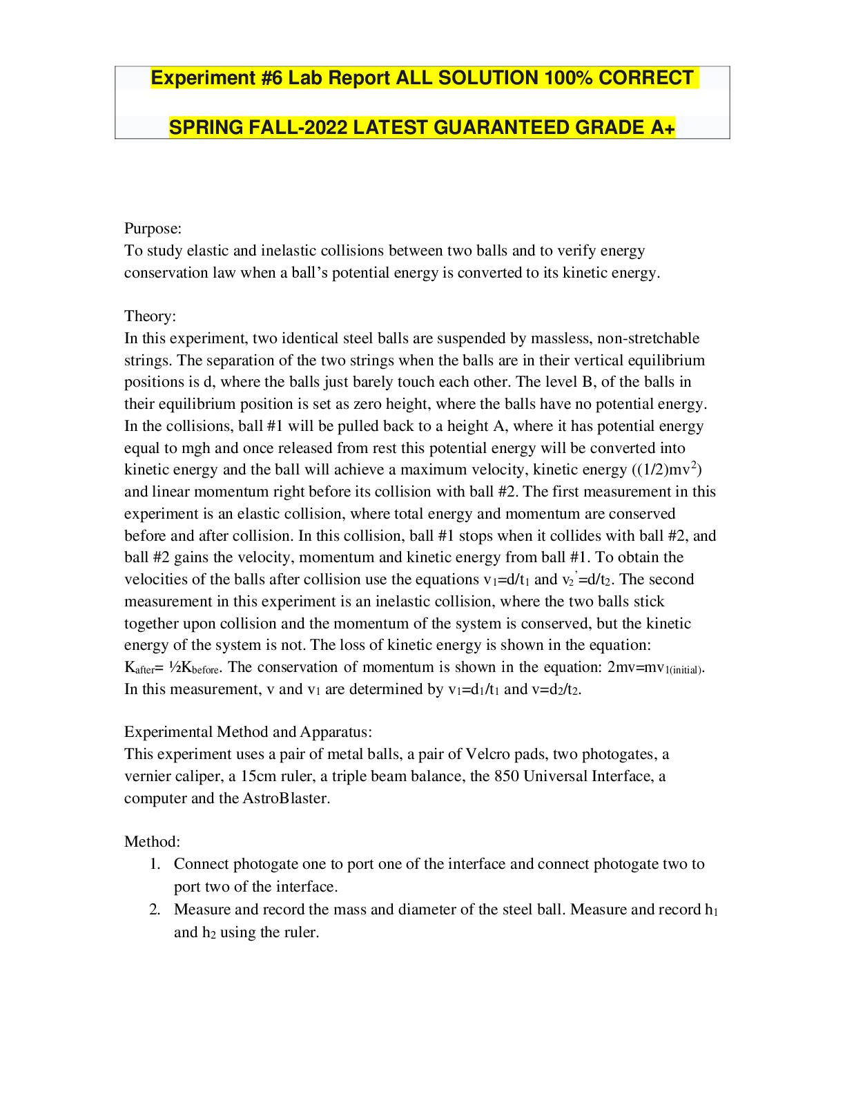 Physics > Report > Experiment #6 Lab Report ALL SOLUTION 100% CORRECT SPRING FALL-2022 LATEST GUARANTEED GRADE A+ (All)