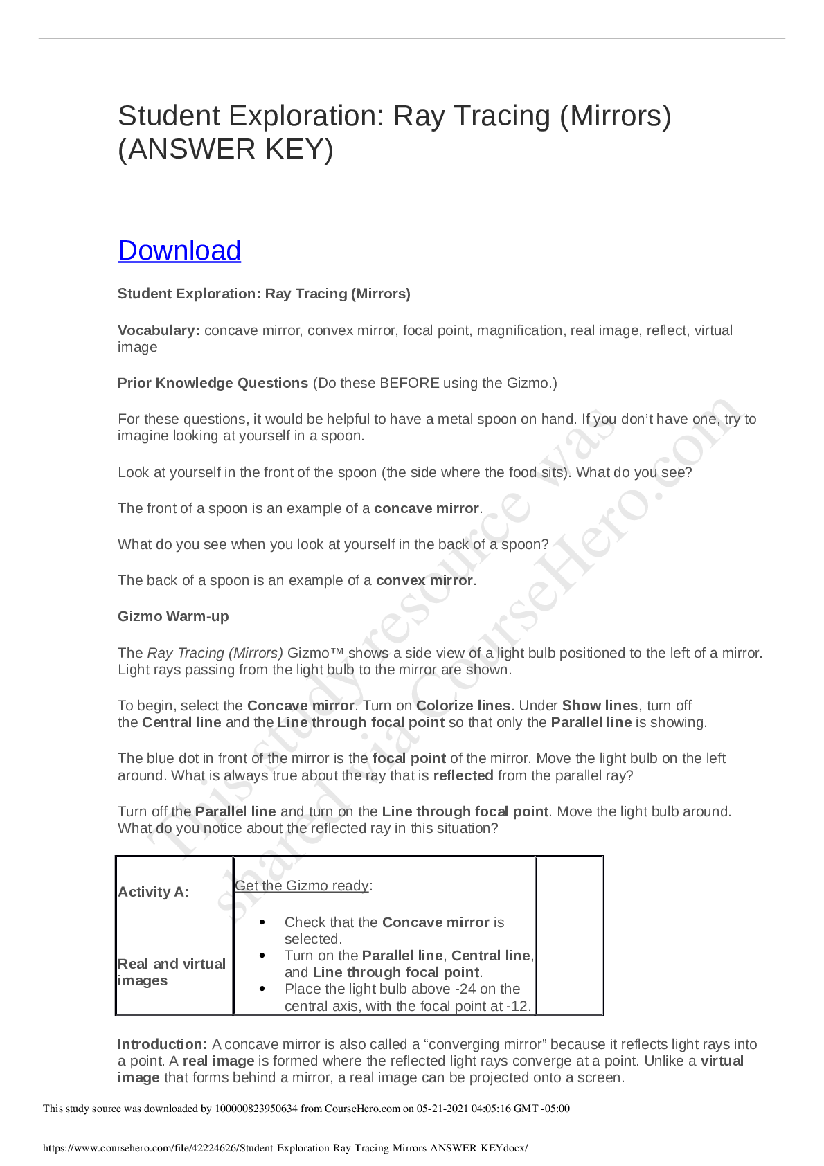 Physics > Final Exam Review > Student Exploration: Ray Tracing (Mirrors) (ANSWER KEY) GIZMO (All)