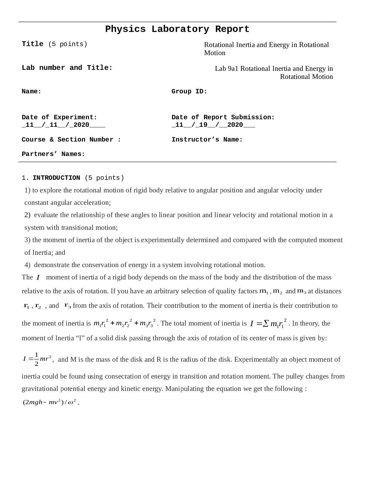 Physics > Lab Report > PHY 122 - Arizona State University. PHY 122: Rotational Motion Lab Report. To understand angular acceleration, torque, and moment of inertia for a system of a mass hanging from a pulley. (All)