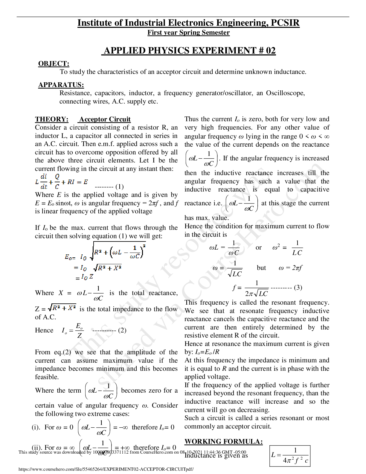 Physics > Experiment > Institute of Industrial Electronics Engineering, PCSIR First year Spring Semester APPLIED PHYSICS EXPERIMENT # 02 (All)