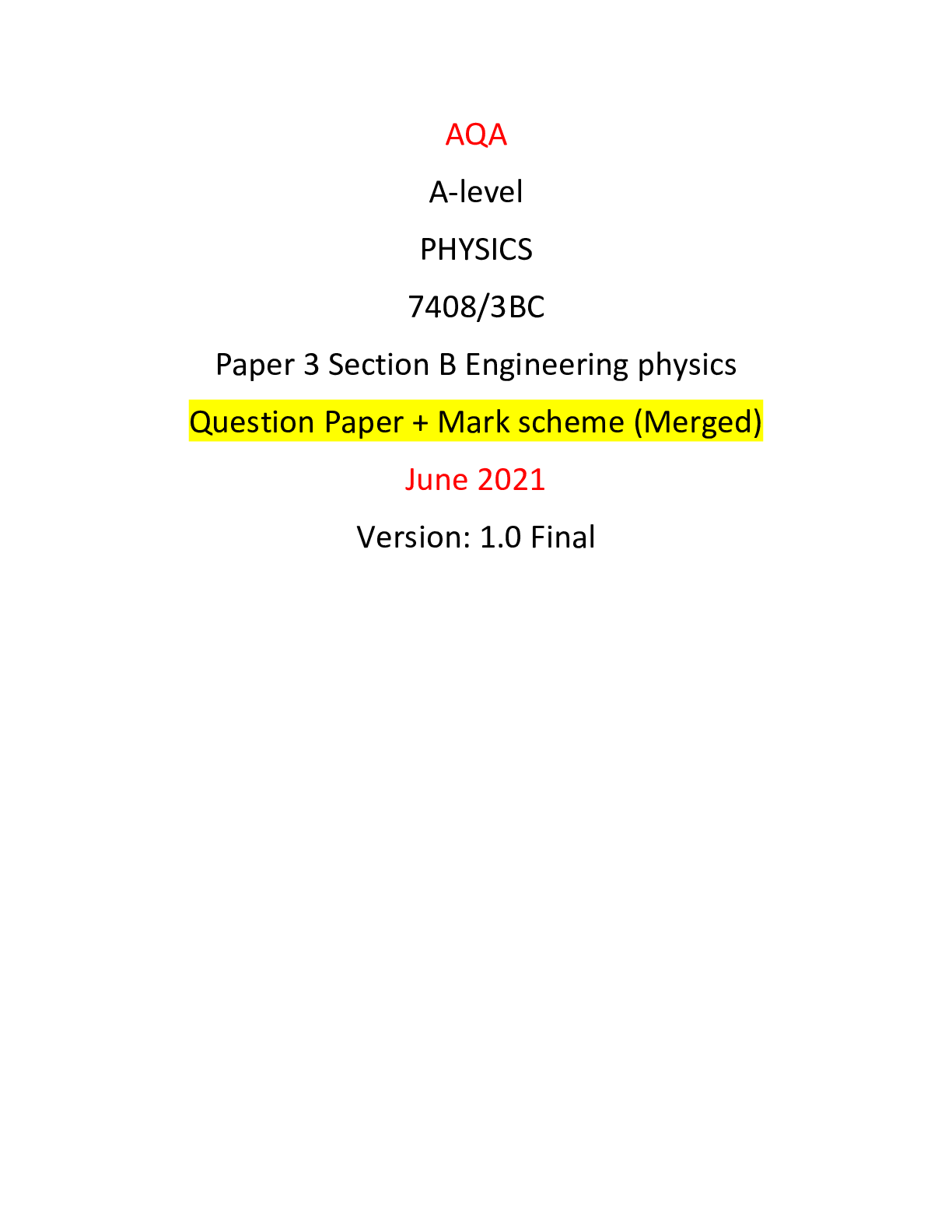 Physics > AQA QUESTION and MARK SCHEMES > AQA A-level PHYSICS 7408/3BC Paper 3 Section B Engineering physics Question Paper + Mark scheme (Merged) June 2021 Version: 1.0 Final (All)