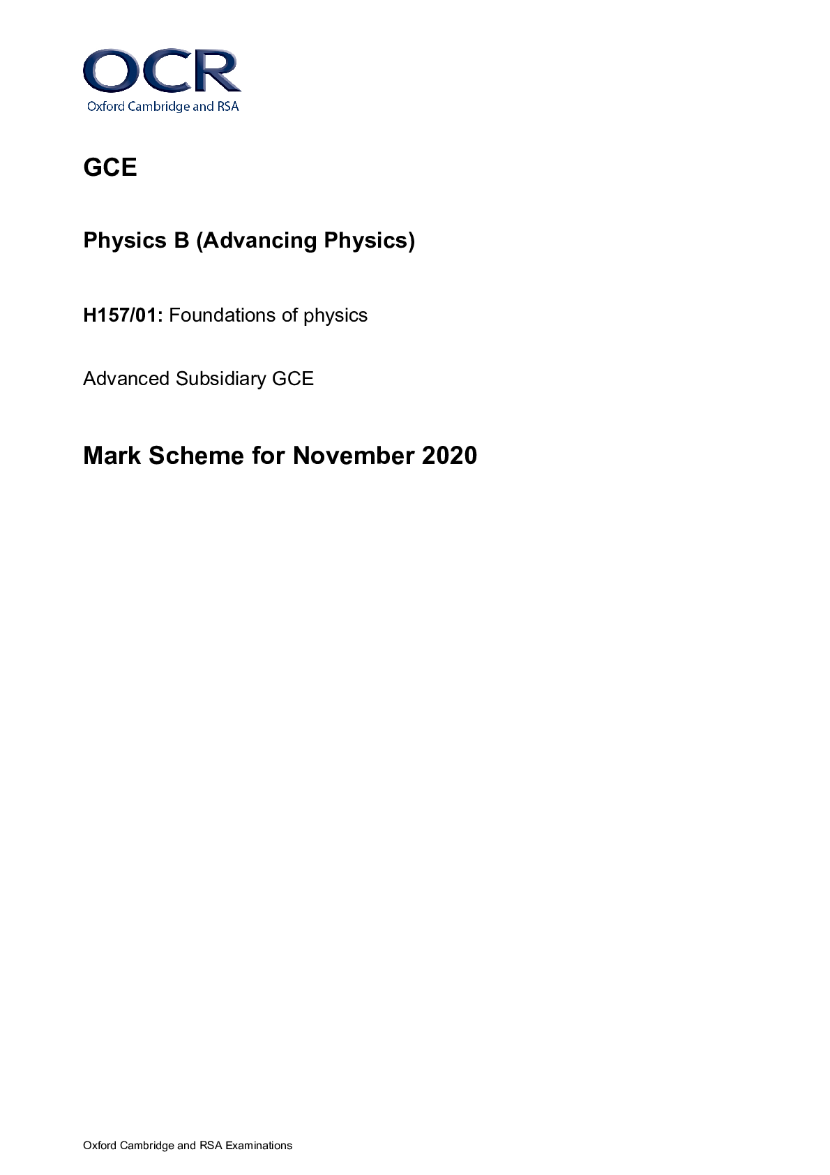 Physics > AS Mark Scheme > GCE Physics B (Advancing Physics) H157/01: Foundations of physics Advanced Subsidiary GCE Mark Scheme for November 2020 (All)