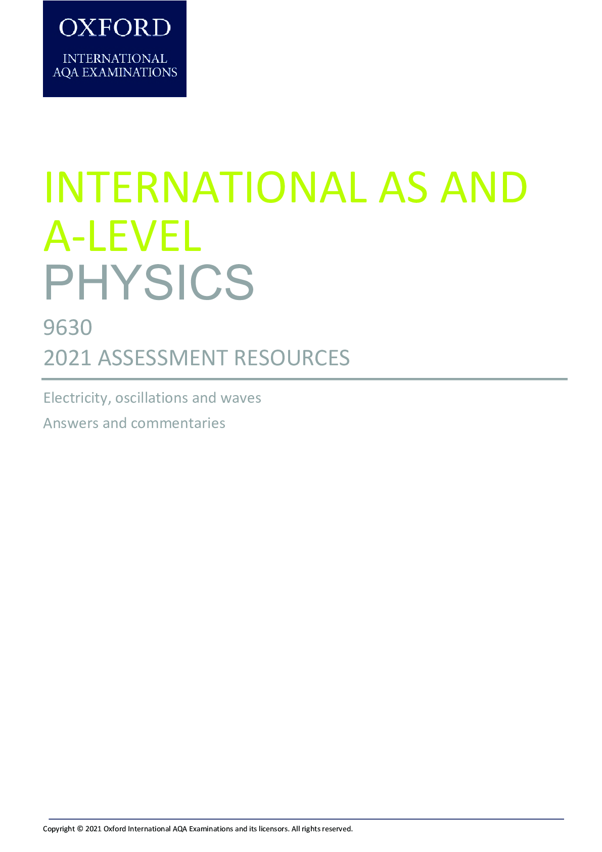 Physics > ANSWERS AND COMMENTARIES > INTERNATIONAL AS AND A-LEVEL PHYSICS 9630 2021 ASSESSMENT RESOURCES Electricity, oscillations and waves Answers and commentaries (All)