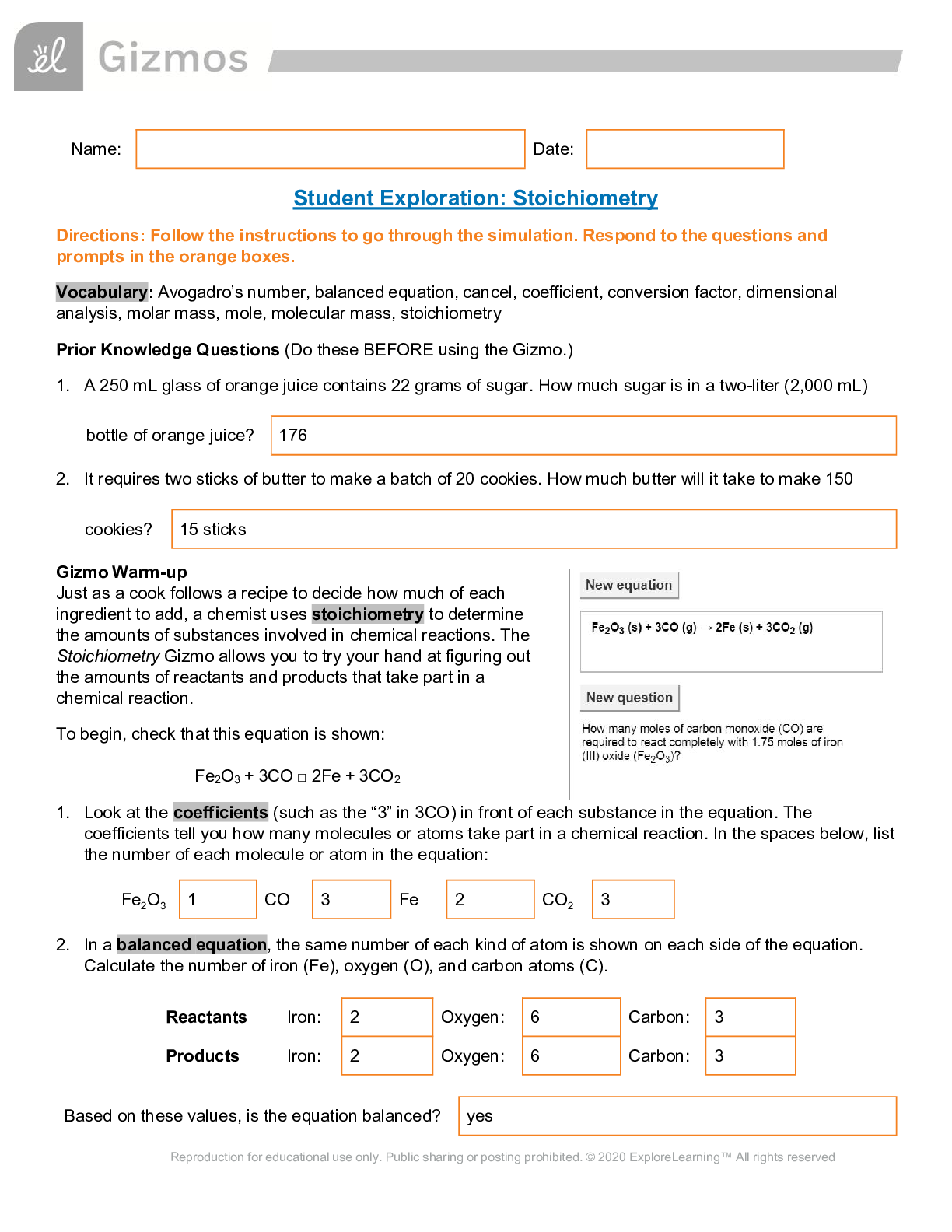 Physics > ANSWERS AND COMMENTARIES > GIZMO Student Exploration Stoichiometry Answers 2022 (All)