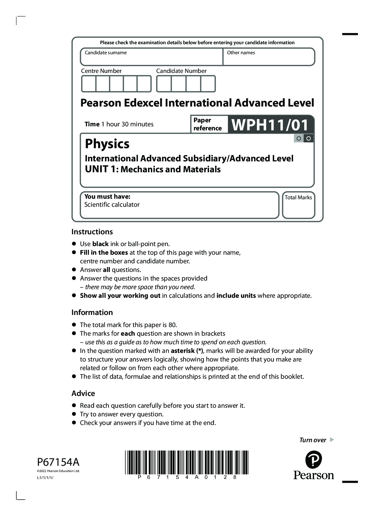 Physics > Edexcel Question Paper > Pearson Edexcel IAL WPH11/01 AS/A Level Physics International Advanced Subsidiary/Advanced Level UNIT 1: Mechanics and Materials. QP Jan 2022 (All)