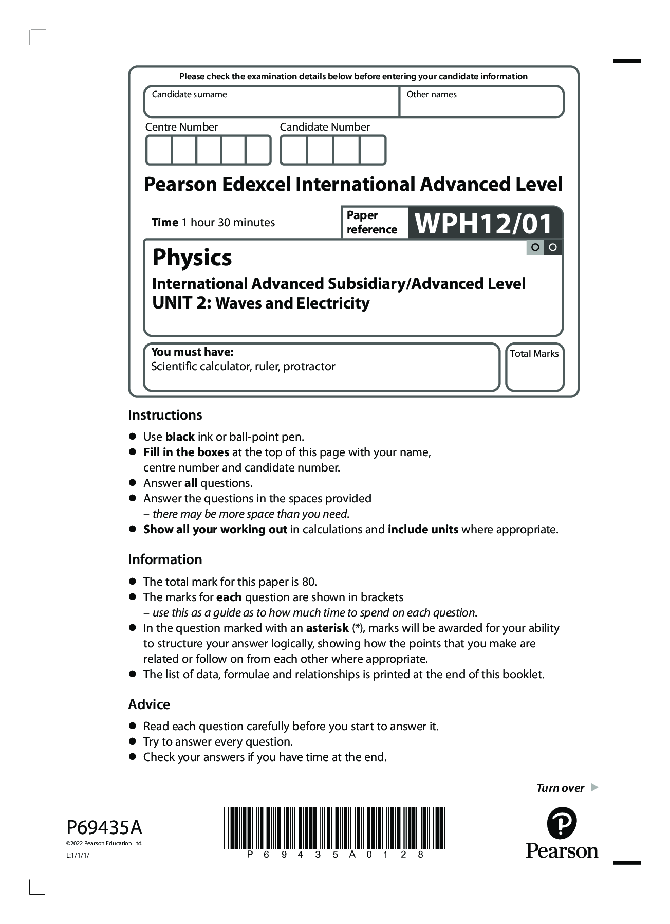 Physics > Edexcel Question Paper > Pearson Edexcel IAL WPH12/01 AS/A Level Physics International Advanced Subsidiary/Advanced Level UNIT 2: Waves and Electricity. QP Jan 2022 (All)