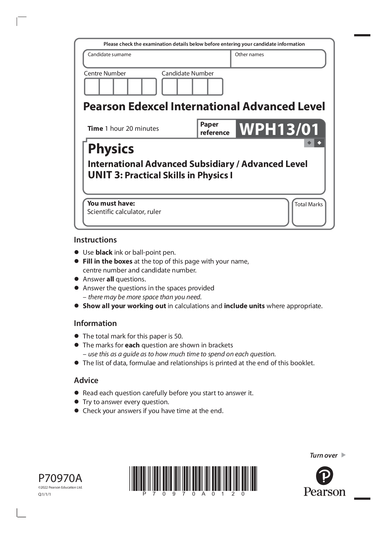 Physics > Edexcel Question Paper > Pearson Edexcel IAL WPH13/01 AS/A Level Physics International Advanced Subsidiary / Advanced Level UNIT 3: Practical Skills in Physics I. QP Jan 2022 (All)