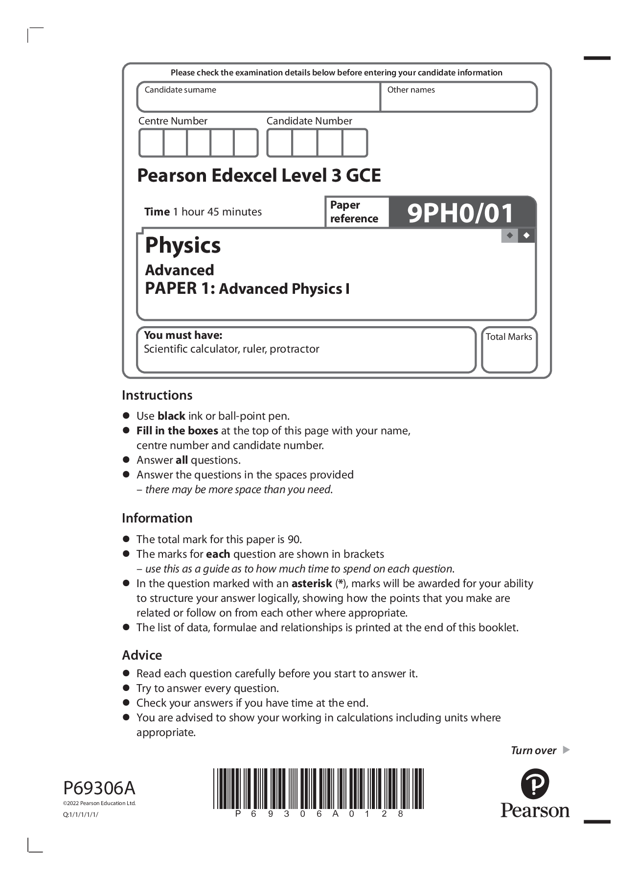 Physics > Edexcel Question Paper > Pearson Edexcel Level 3 GCE Physics Advanced PAPER 1: Advanced Physics I 9PH0/01 (All)