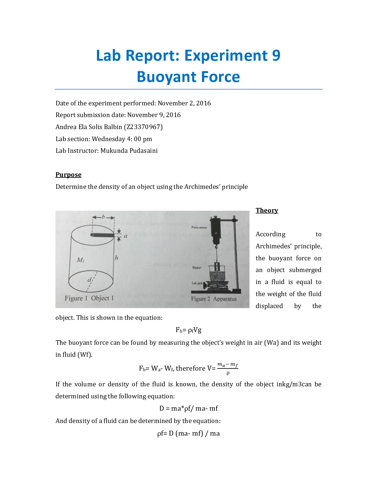 Physics > Lab Report > Florida Atlantic University - PHY 2048LExperiment 9 Lab Report: PHY2048L 007 Experiment 9: Buoyant Force (All)