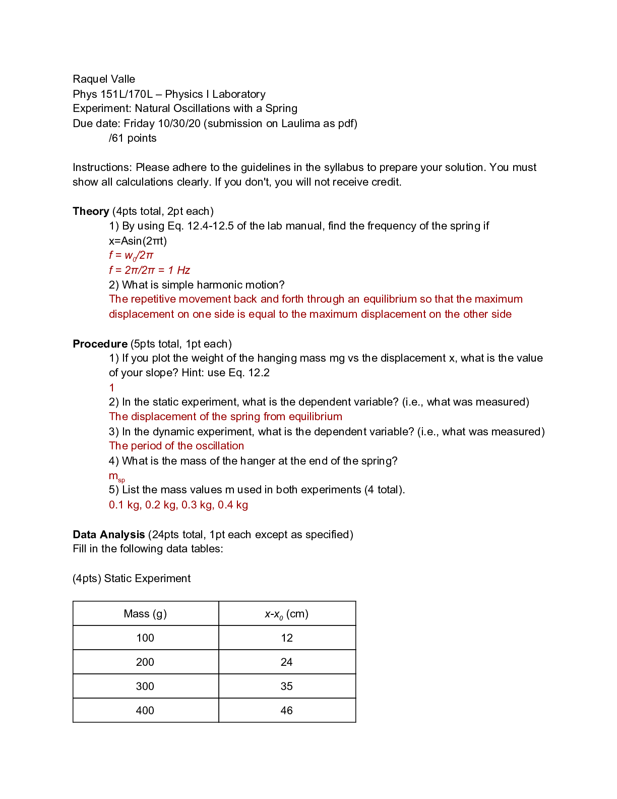 Physics > Lab Report > University of Hawaii, Manoa - PHYS 151LNatural Oscillations with a Spring_Valle (All)