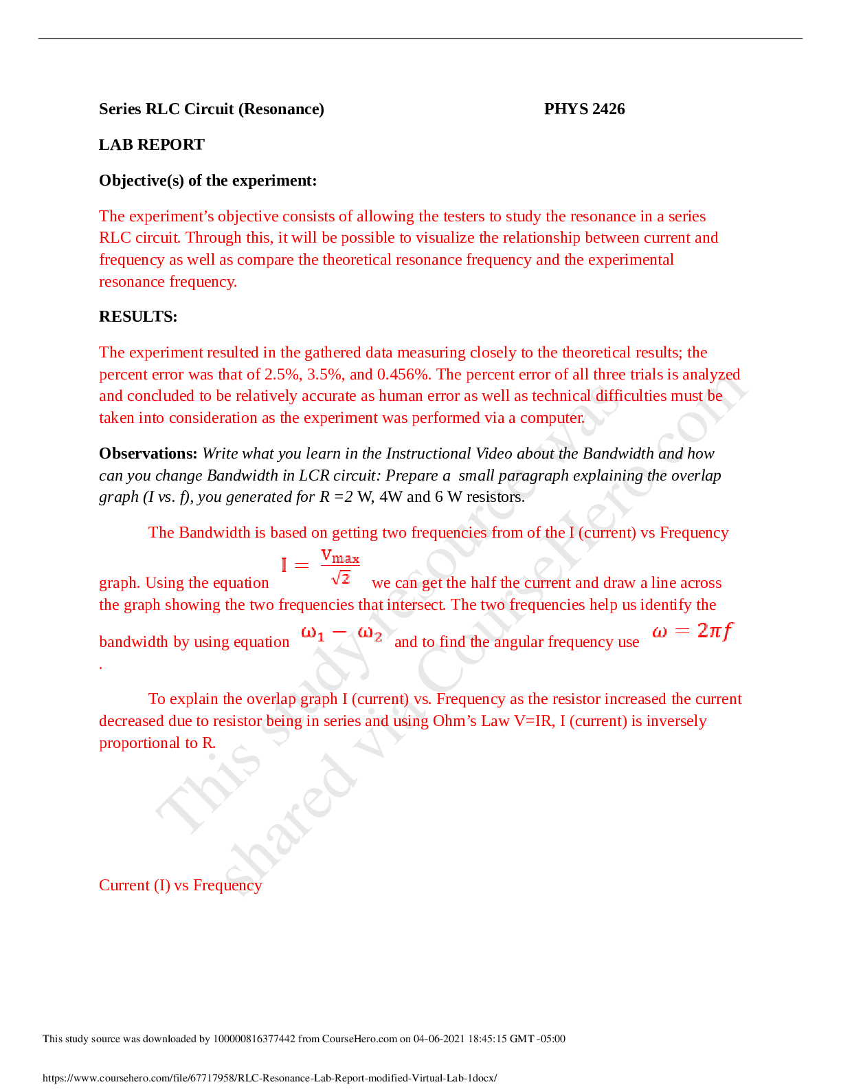 Physics > QUESTIONS & ANSWERS > RLC Resonance- Lab Report_modified-Virtual Lab (1) (All)