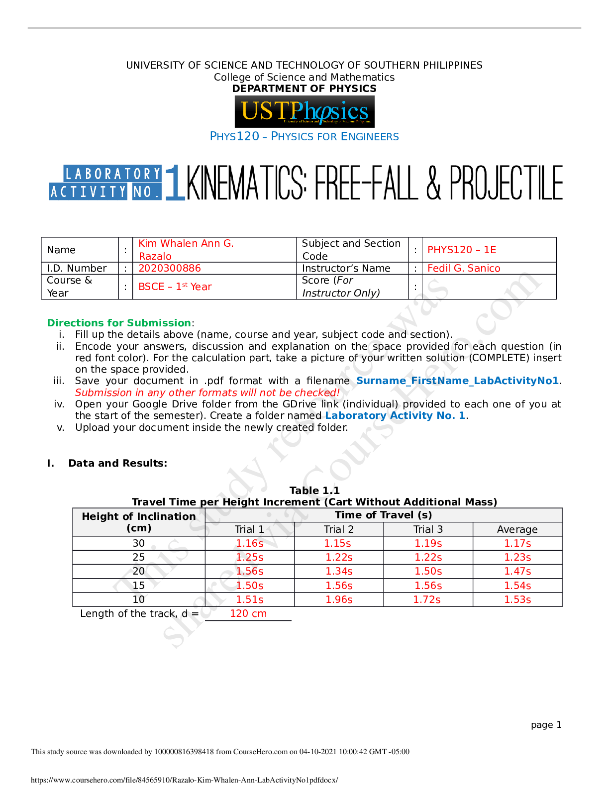 Physics > Lab Report > University of Notre Dame - PHYS 101Razalo_Kim Whalen Ann_LabActivityNo1 (All)