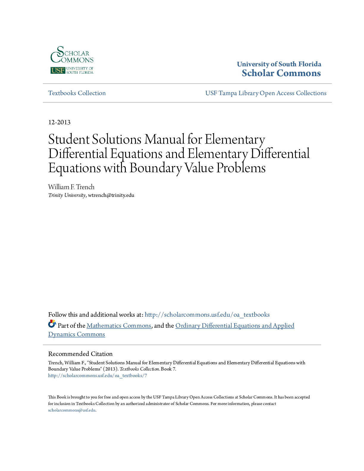 Physics > STUDY GUIDE > Student Solutions Manual for Elementary Differential Equations and Elementary Differential Equations with Boundary Value Problems William F. Trench (All)