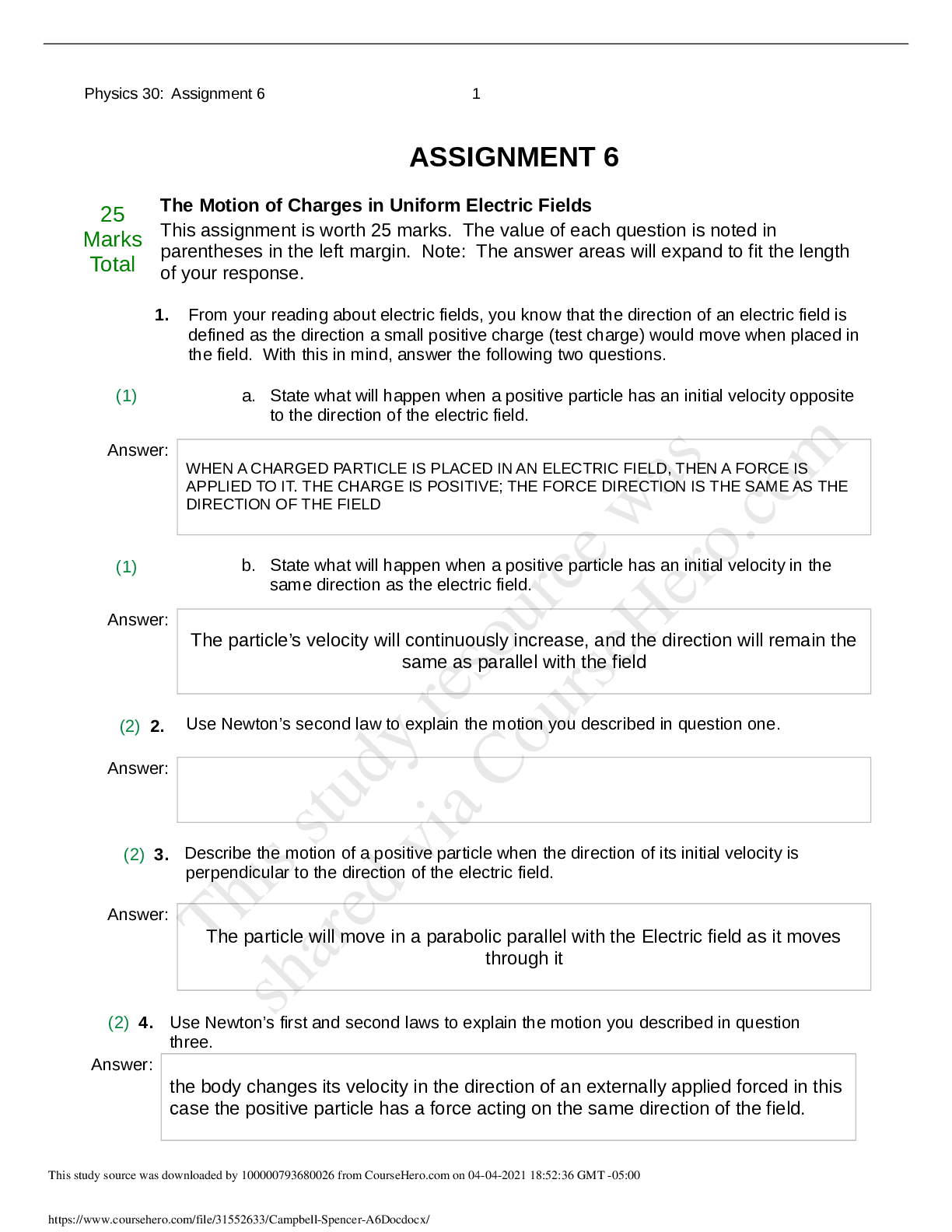 Physics > QUESTIONS & ANSWERS > Beiseker Community School - PHYSICS 30Campbell_Spencer_A6.Doc (All)