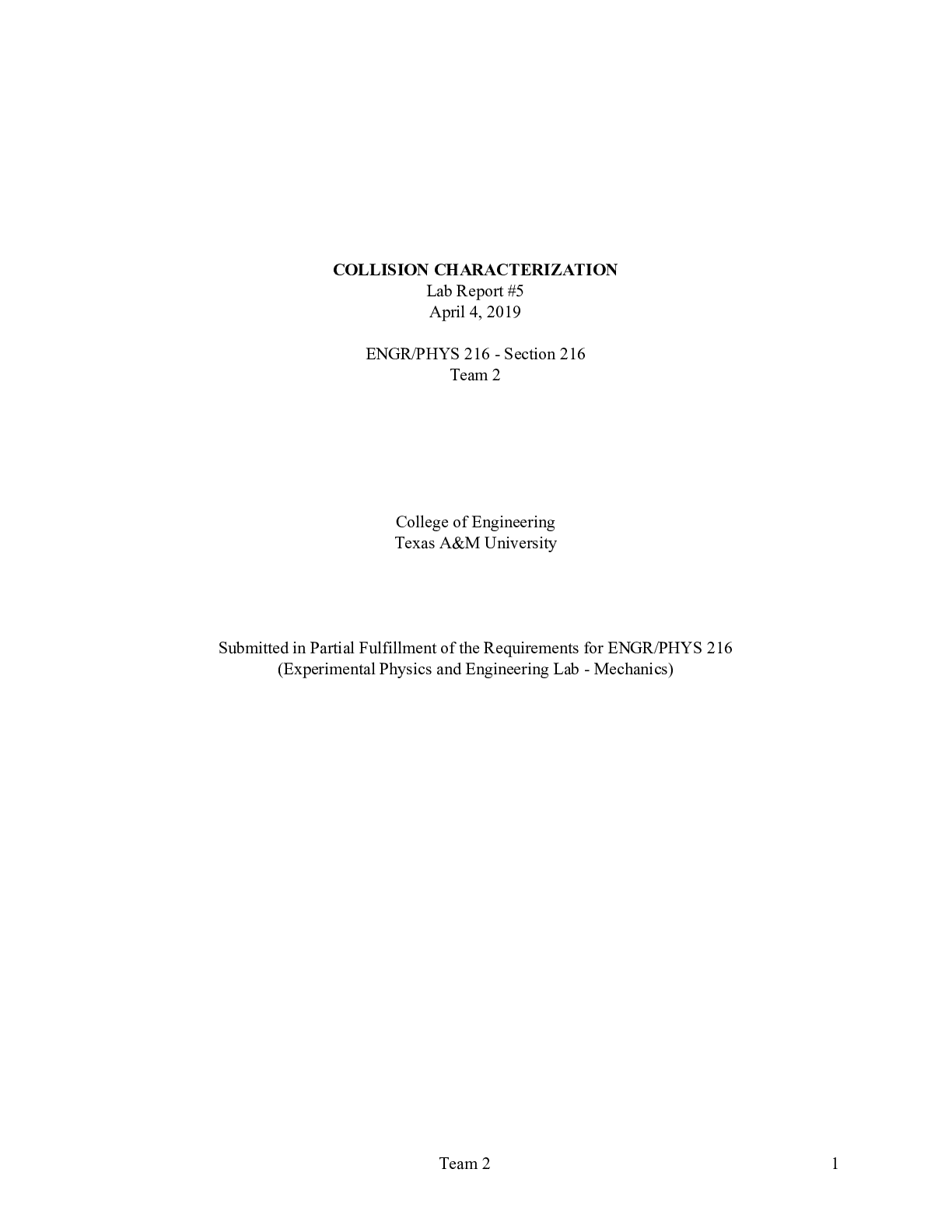 Physics > Lab Report > Texas A&M University - ENGR 217Lab Report 5_ Collision Characterization (1). (All)