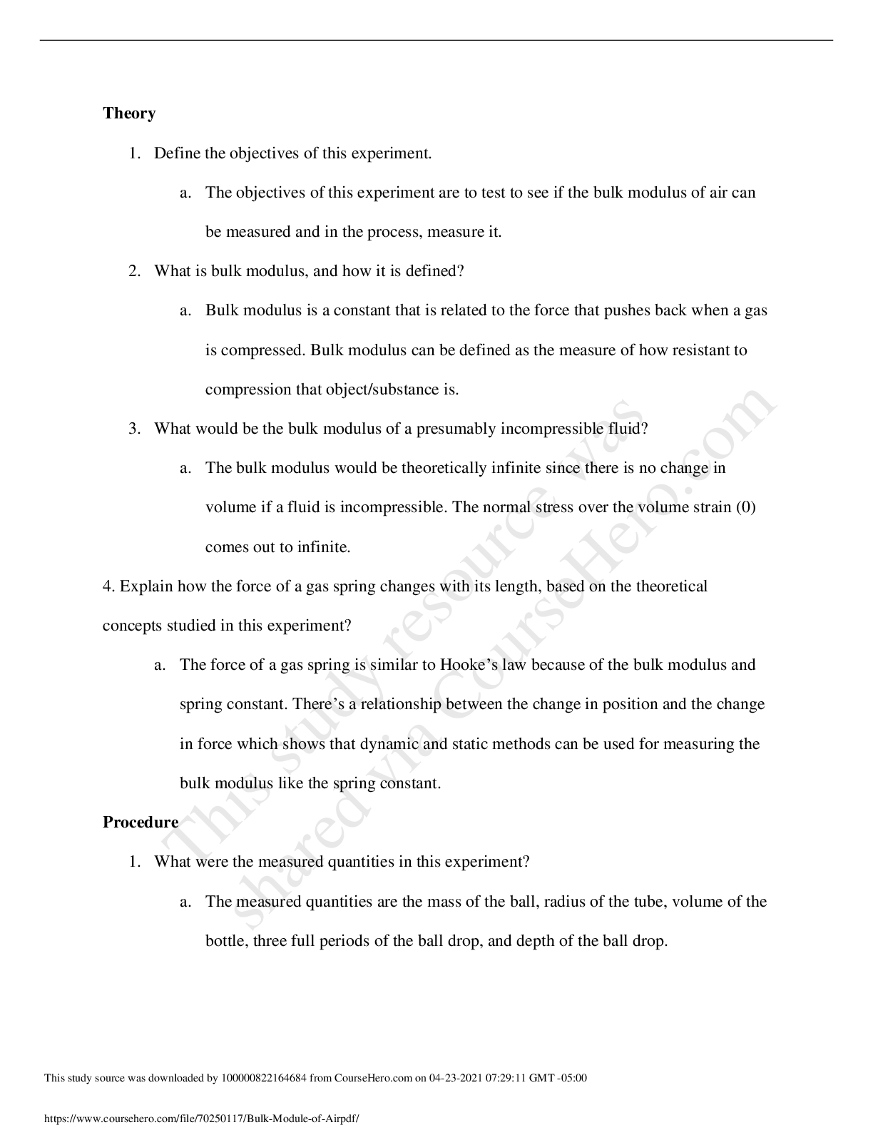 Physics > Lab Report > University of Hawaii, ManoaPHYS 15114 Bulk Modulus of Air Worksheet Fall 2020 (All)