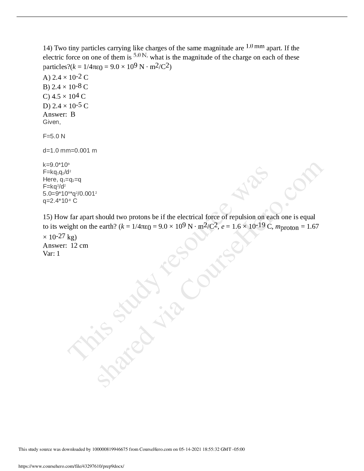 Physics > QUESTIONS & ANSWERS > Hunter College, CUNY PHYS 120 prep 9. (All)