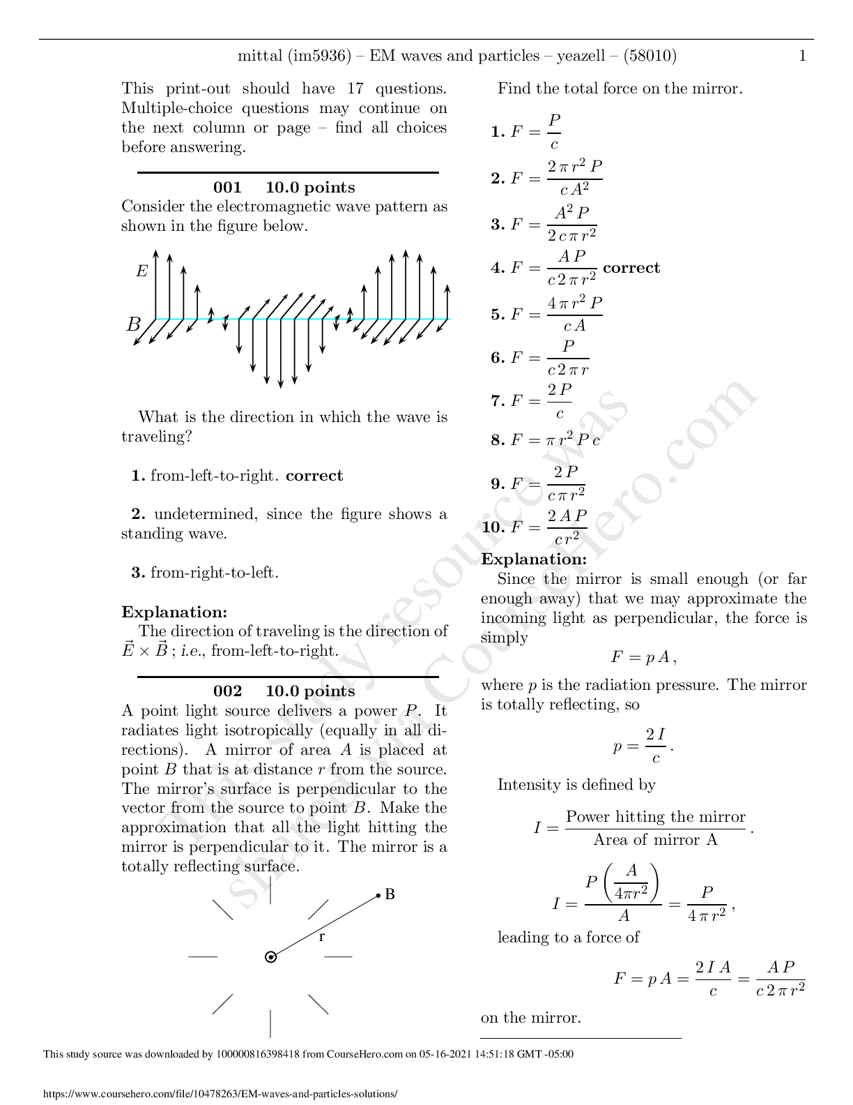 Physics > QUESTIONS & ANSWERS > University of TexasPHY 317LEM waves and particles-solutions (All)
