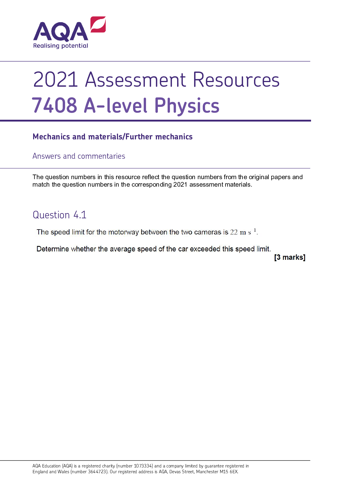 Physics > MARK SCHEMES > AS Physics 7407 Mechanics and materials/electricity ANSWERS and COMMENTARIES (2021 Assessment resources). (All)