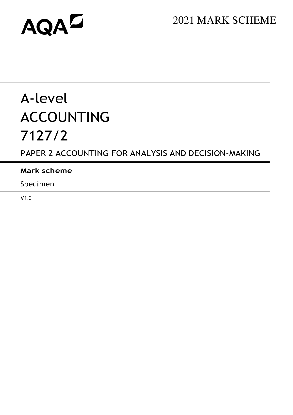 Physics > EXAM > AQA A-level ACCOUNTING 7127/2 PAPER 2 ACCOUNTING FOR ANALYSIS AND DECISION-MAKING MARK SCHEME (All)