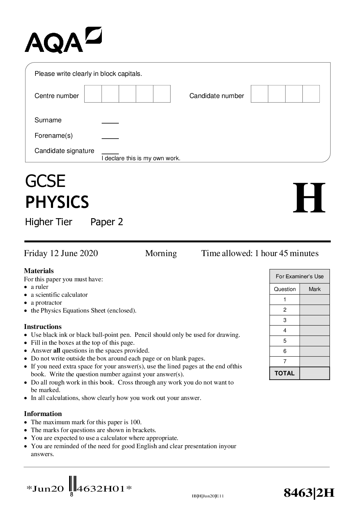Physics > AQA > GCSE PHYSICS 8463/1H Paper 1 Higher Tier (All)