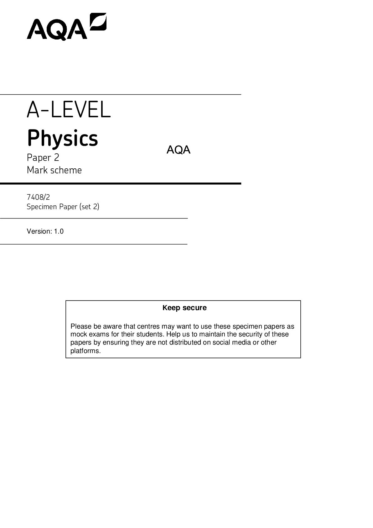 Physics > AQA > A-LEVEL Physics Paper 2 Mark scheme 7408/2 Specimen Paper (set 2) AQA (All)