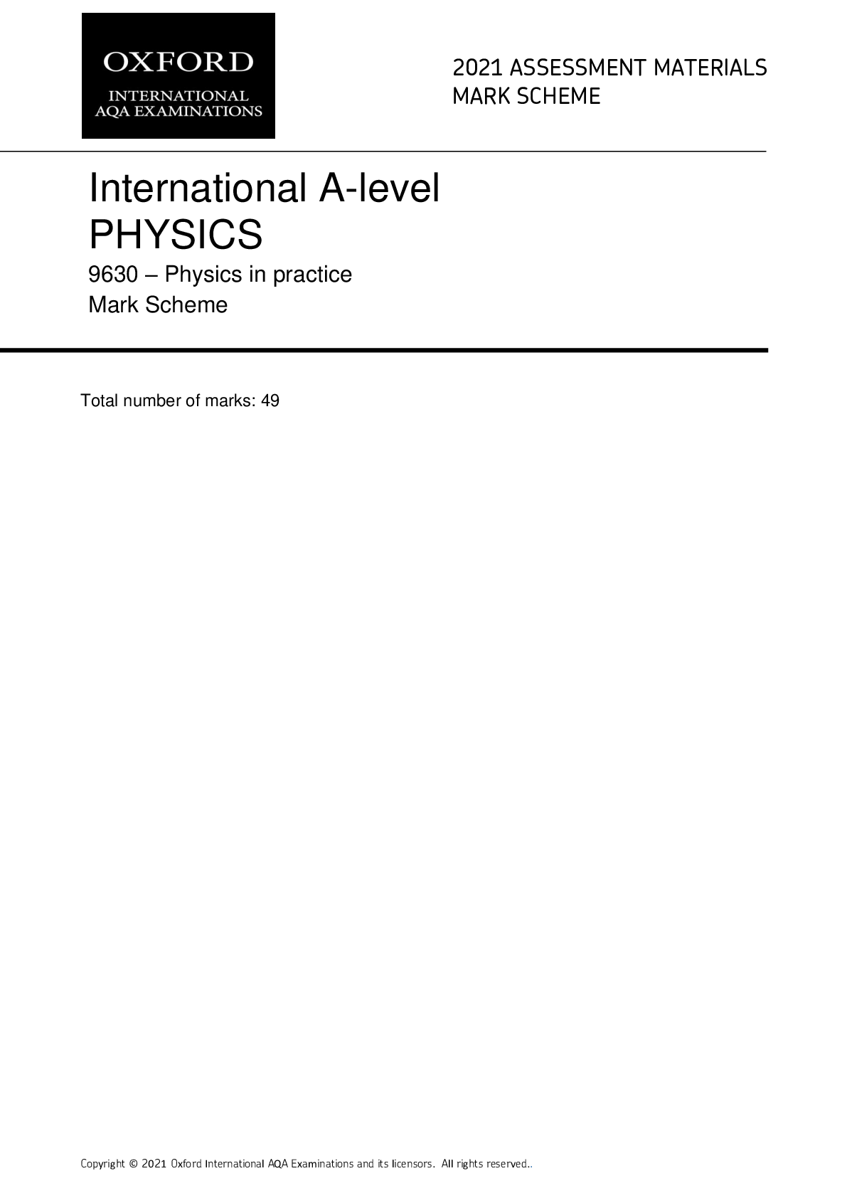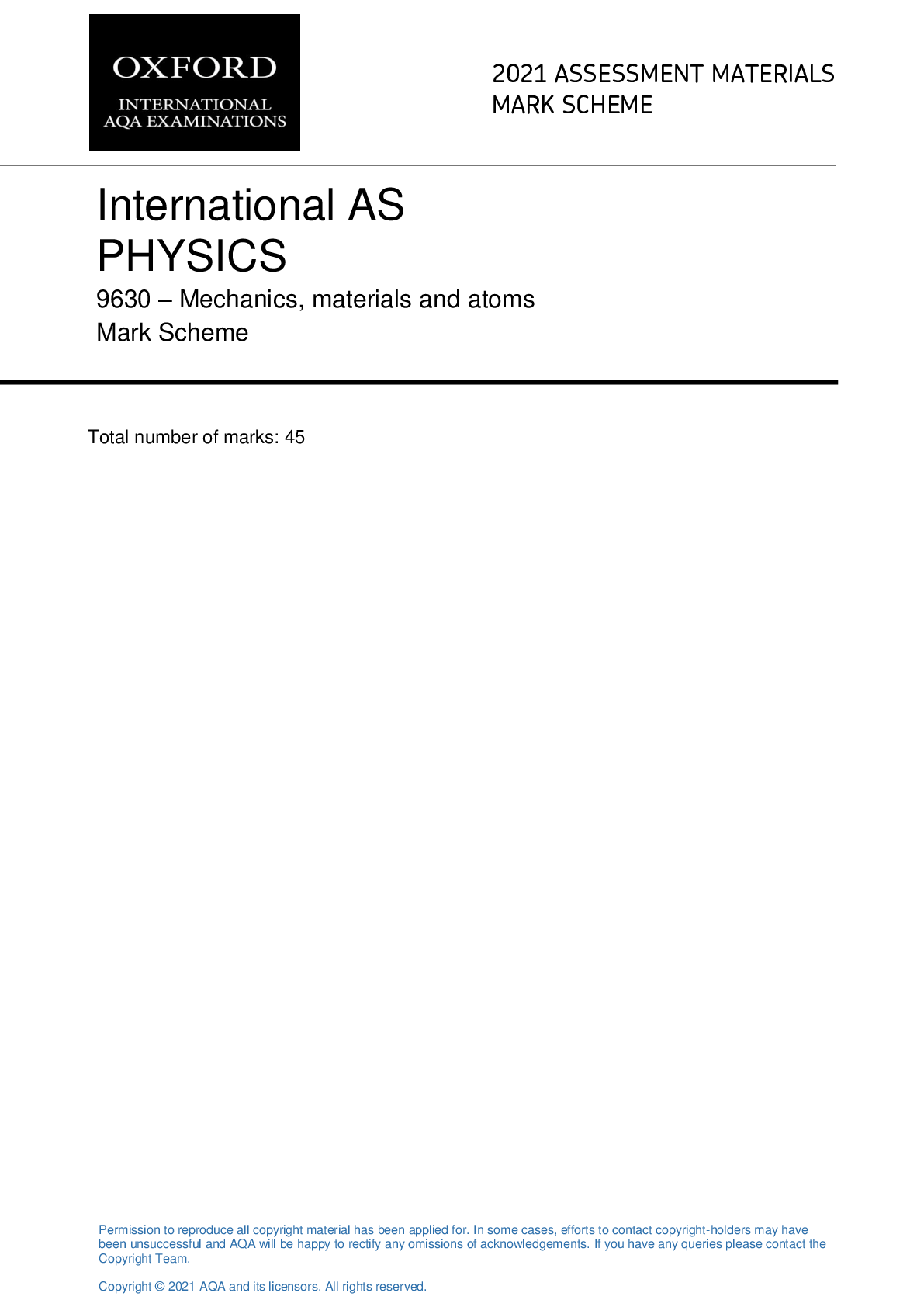 Physics > QUESTION PAPER & MARK SCHEME > Oxford AQA International AS PHYSICS 9630 – Mechanics, materials and atoms 2021 ASSESSMENT MATERIALS MARK SCHEME and QP. (All)