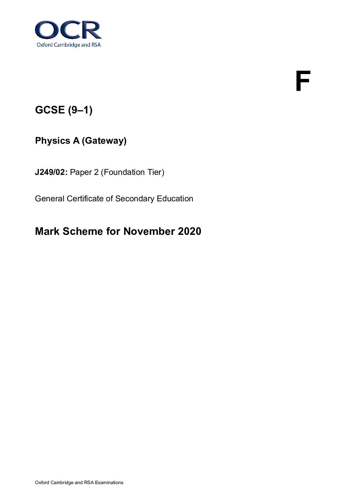 Physics > MARK SCHEMES > GCSE (9–1) Physics A (Gateway) J249/02: Paper 2 (Foundation Tier) General Certificate of Secondary Education Mark Scheme for November 2020 (All)