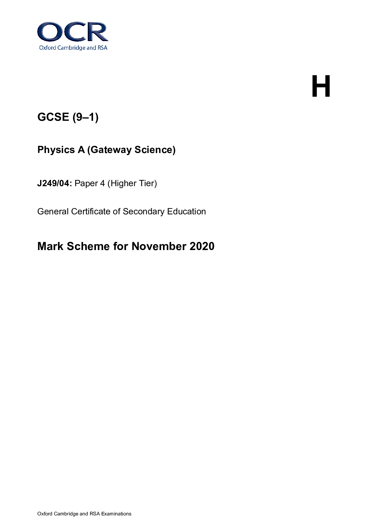 Physics > MARK SCHEMES > GCSE (9–1) Physics A (Gateway Science) J249/04: Paper 4 (Higher Tier) General Certificate of Secondary Education Mark Scheme for November 2020 (All)