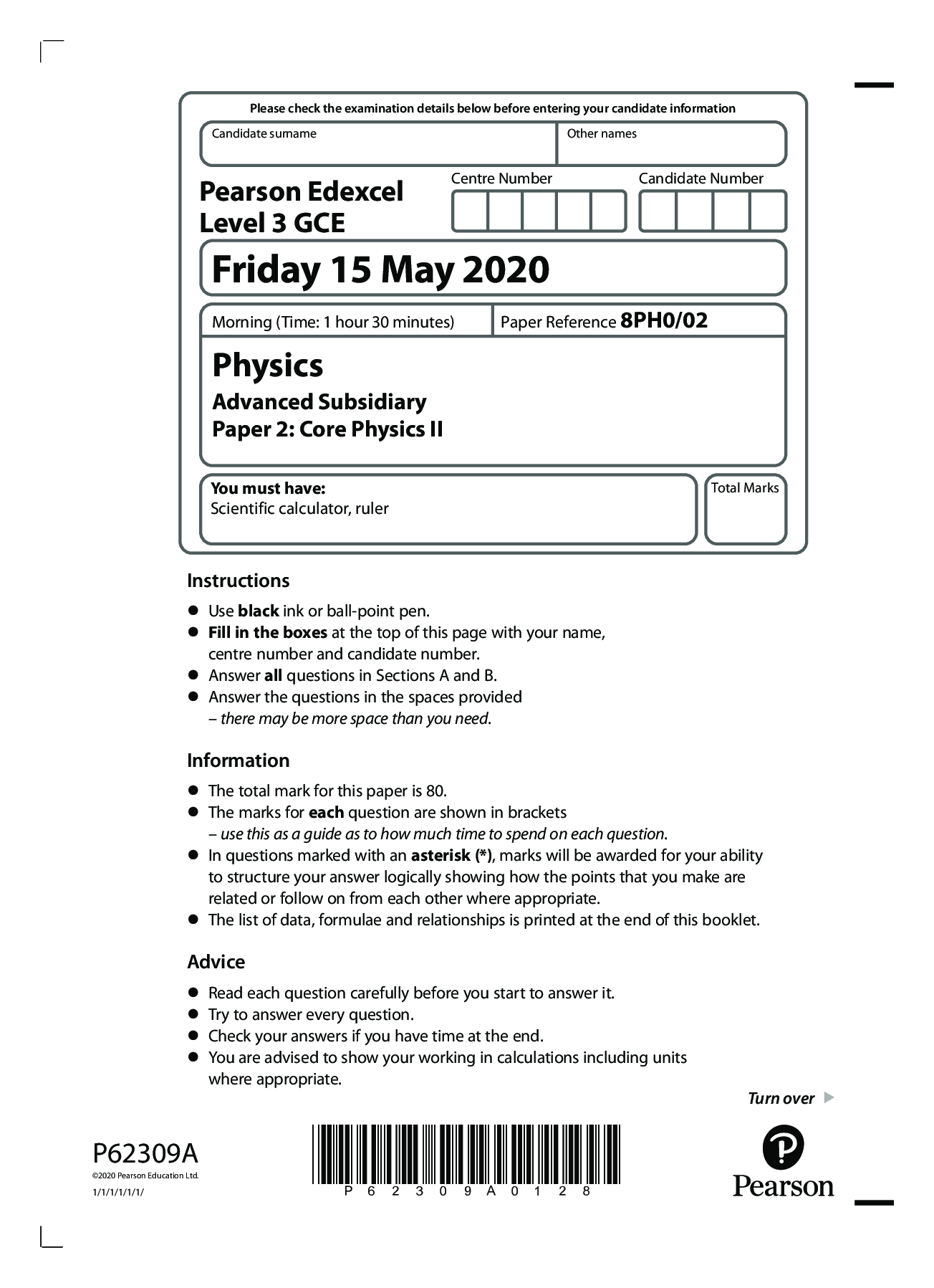 Physics > Edexcel Question Paper > Pearson Edexcel Level 3 GCE_Physics_8PH0/02 Question Paper 2020 | Core Physics II (All)