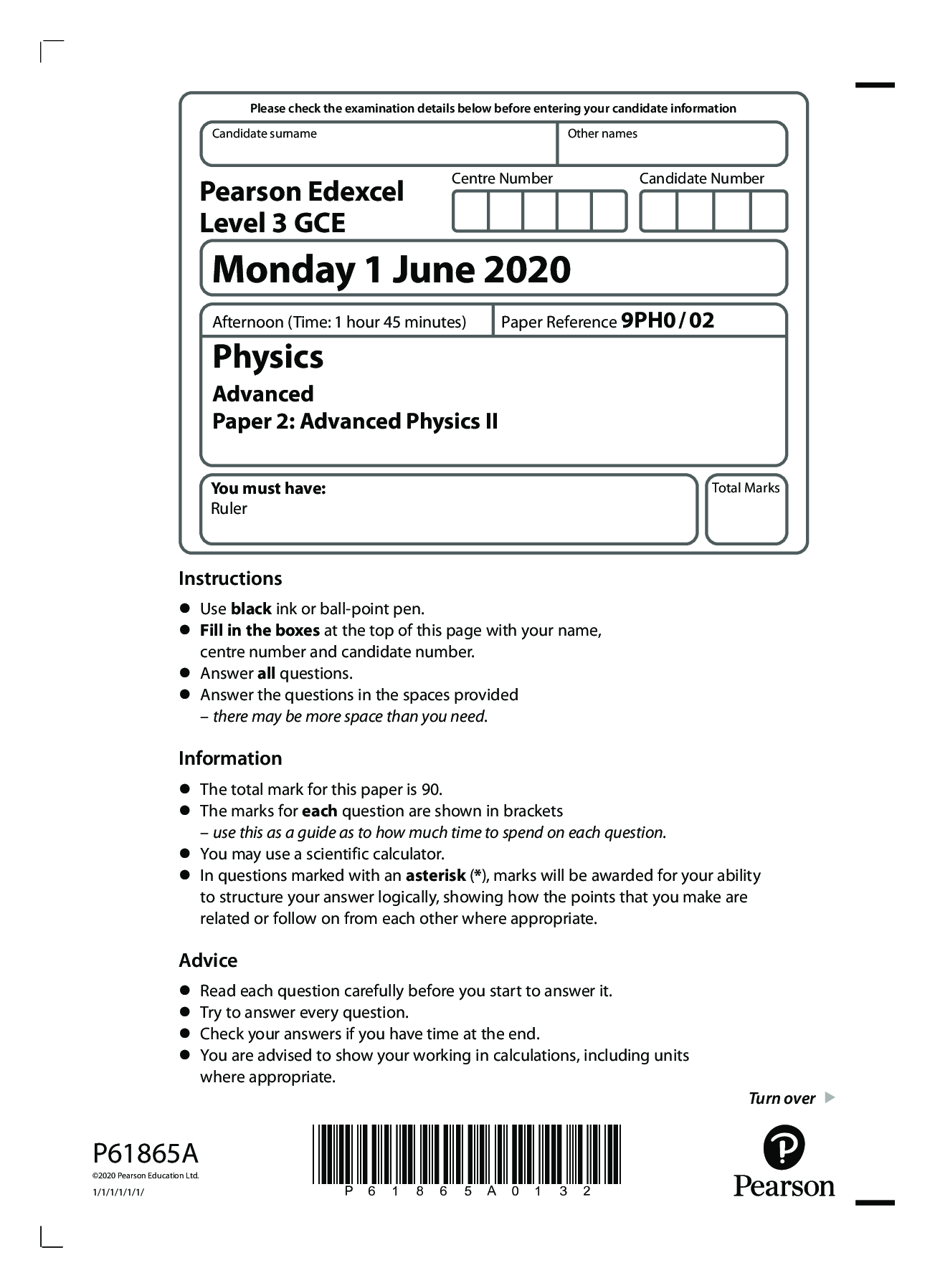 Physics > Edexcel Question Paper > Pearson Edexcel Level 3 GCE_Physics_9PH0/01 Question Paper 2020 | Advanced Physics I (All)
