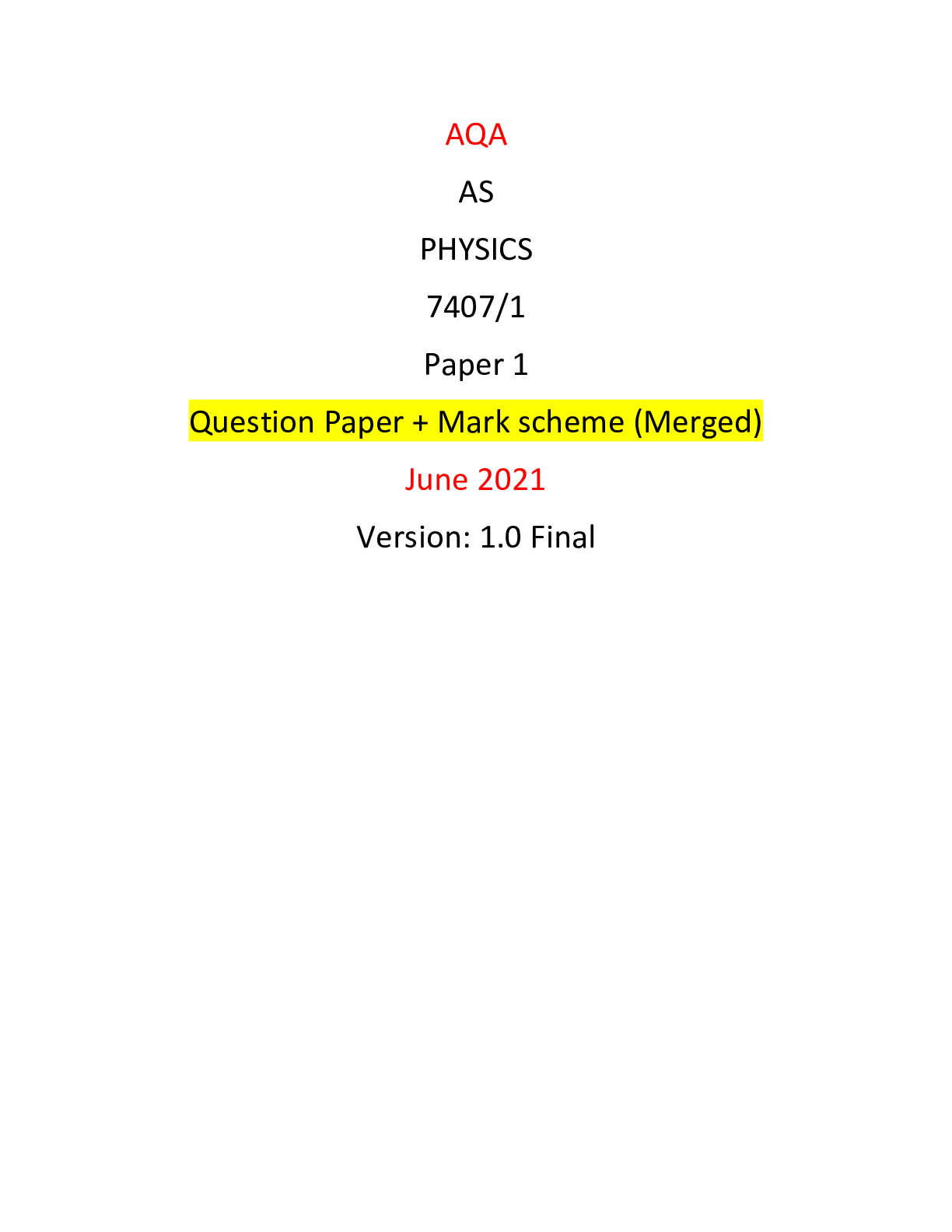 Physics > AQA QUESTION and MARK SCHEMES > AQA AS PHYSICS 7407/1 Paper 1 Question Paper + Mark scheme (Merged) June 2021 Version: 1.0 Final (All)
