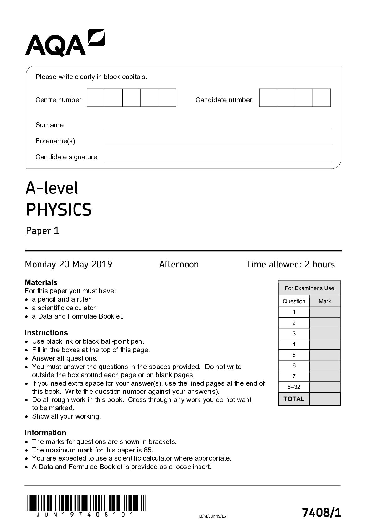 Physics > AQA Question Papers > A- Level Physics Paper 1 Questions Paper (All)