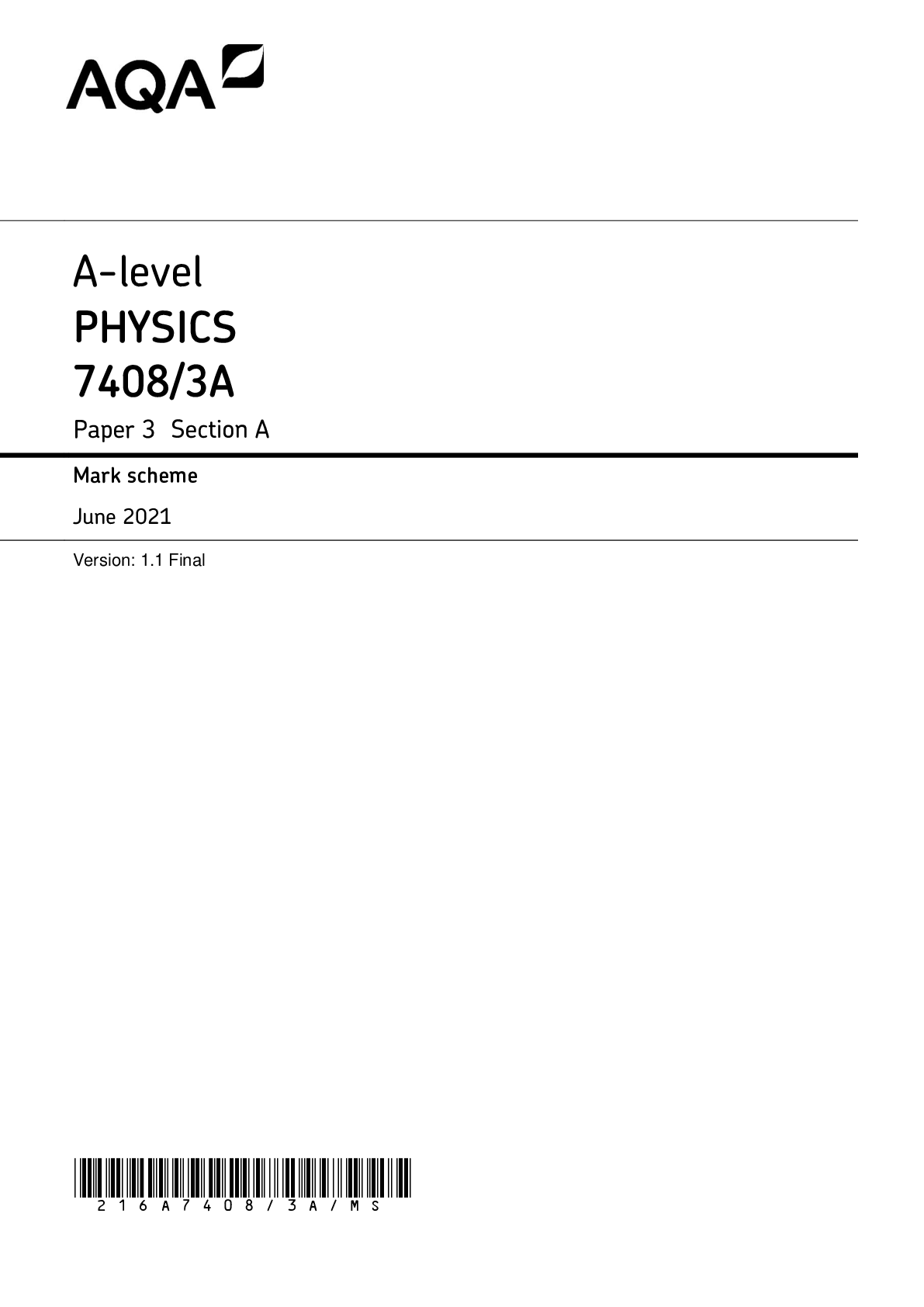 Physics > AQA > AQA A-level PHYSICS 7408/3A Paper 3 Section A Mark scheme June 2021 Version: 1.1 Final (All)