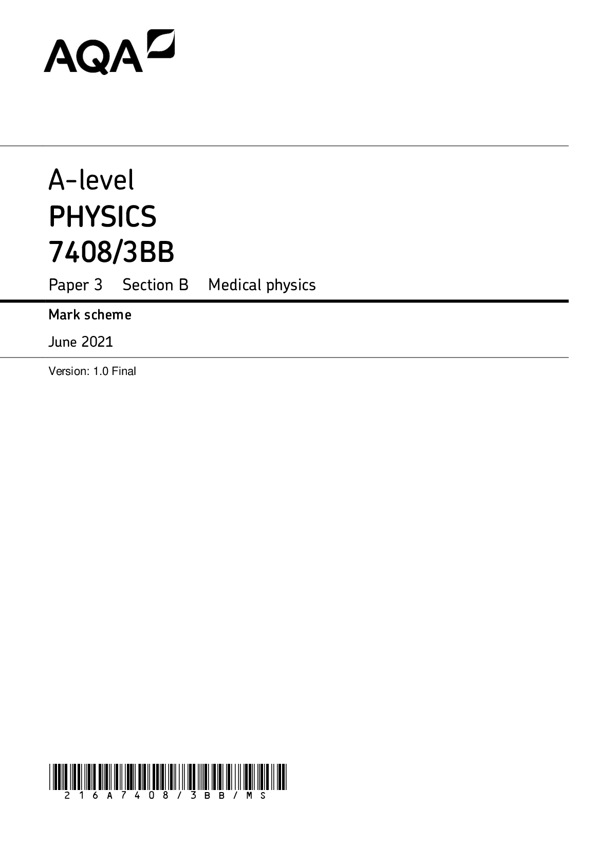 Physics > AQA > AQA A-level PHYSICS 7408/3BB Paper 3 Section B Medical physics Mark scheme June 2021 Version: 1.0 Final (All)