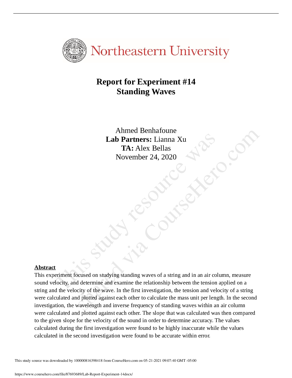 Physics > Lab Report > Report for Experiment #14 Standing Waves (All)