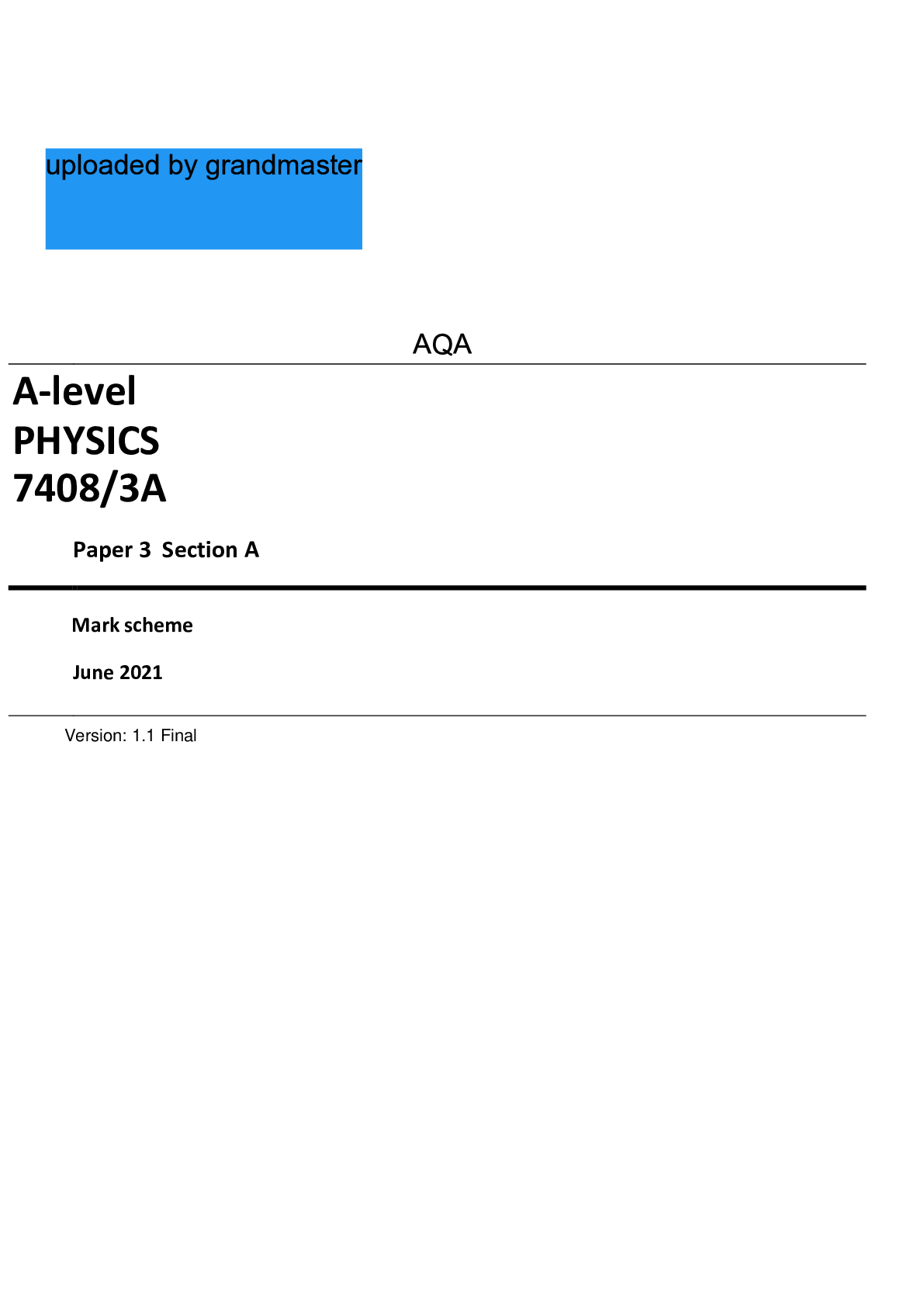 Physics > AS Mark Scheme > A-level PHYSICS 7408/3A Paper 3 Section A Mark scheme June 2021 Version: 1.1 Final (All)