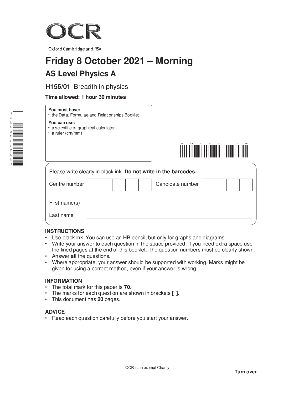 Physics > EXAM > > Interchange AS Level Physics A H156/01 ;Breadth in physics Question Paper Nov 2021. (All)